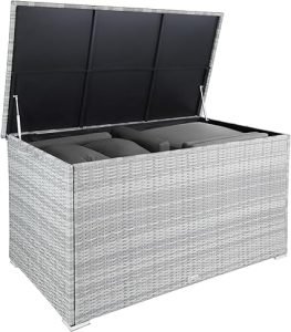 TecTake Arcón de Exterior de Poli Ratán 750L – Baúl de Almacenaje XXL con Forro Interior Extraíble e Impermeable – Caja de Jardín Gris Claro